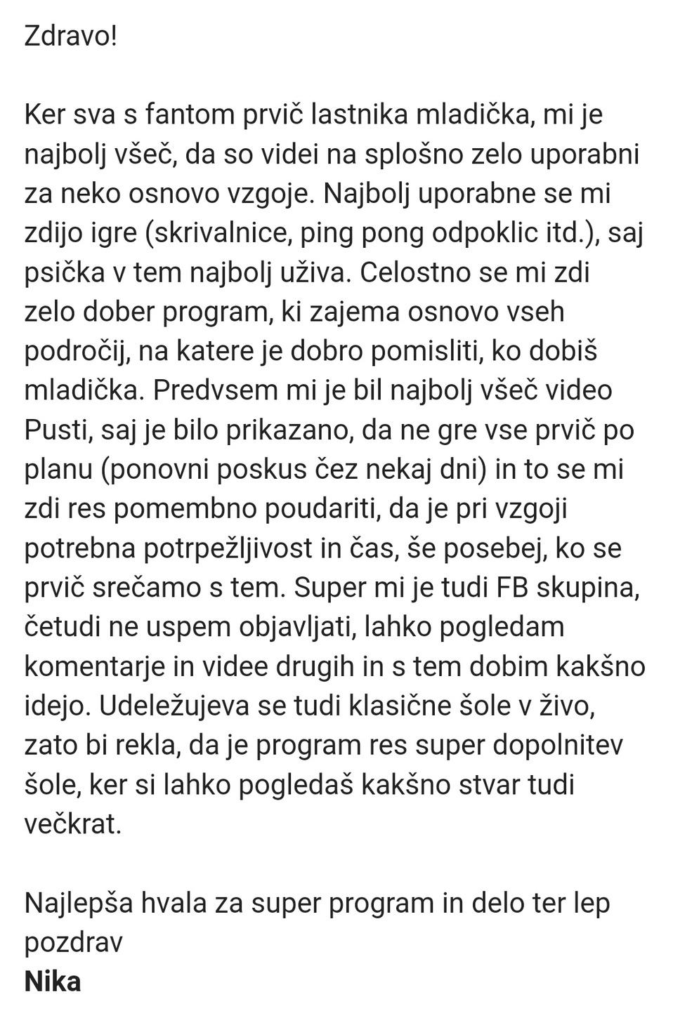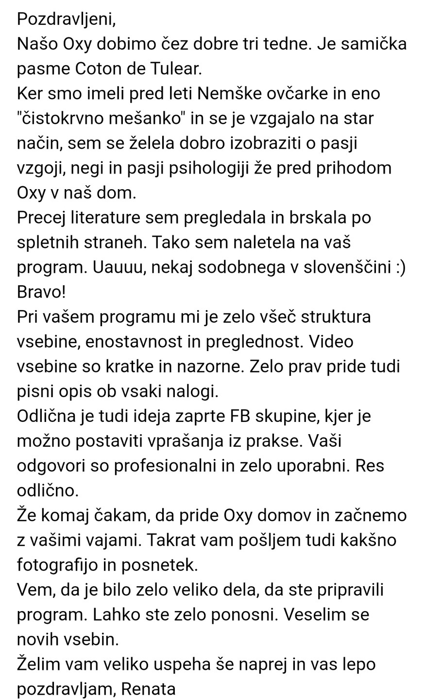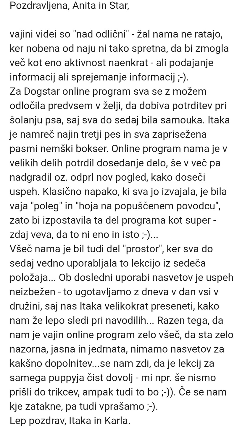Program bi res priporočila vsem lastnikom pasjih mladičkov in pozneje, saj ti da ogromno znanja in odgovorov, ki jih na začetku res potrebuješ, da se prepričaš, da delaš najboljše kar lahko, da vzgojiš res najboljšega pasjega prijatelja. 😊